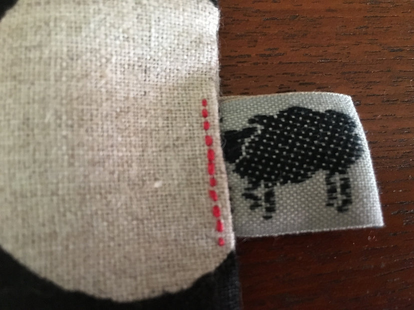羊のリボンを挟んで、ひと針ひと針チクチクチクと手縫いで作りました。